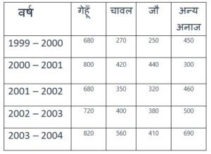 निम्न तालिका 1999–2000 से 2003–2004 की अवधि के लिए एक राज्य में खाद्यान्न उत्पादन (मिलियन टन में) दर्शाती है। तालिका को पढ़ें और प्रश्नों के उत्तर दें।
