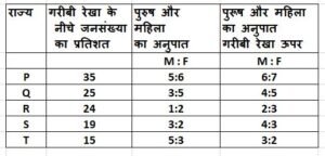 निम्न तालिका मे गरीबी रेखा और (लिंग) के आधार पर पांच राज्यों, P, Q, R, Sऔर T की जनसंख्या का प्रतिशत वितरण दिया गया है।