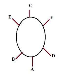 A, B, C, D, E and F are seated around a round table facing its centre.