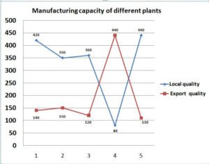 एक कंपनी के पास स्पेयर पार्ट विनिर्माण के लिए पाँच संयंत्र हैं। प्रत्येक संयंत्र स्थानीय गुणवत्ता और निर्यात गुणवत्ता का विनिर्माण करता है। उच्चतम विनिर्माण संयंत्र की स्थानीय गुणवत्ता और निर्यात गुणवत्ता वाली इकाइयों के उत्पादन का अनुपात क्या है?
