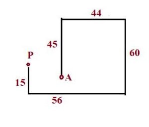 निशांत बिंदु A से चलना शुरू करता है और उत्तर दिशा में 45 km गाड़ी चलाता है। फिर वह दाएँ मुड़ता है, 44 km चलता है। फिर दाएँ मुड़ता है और 60 km चलता है। फिर दाएँ मुड़ता है और 56 km चलता है।अंत में वह दाएँ मुड़ता है, 15 km चलता है और बिंदु P पर रुकता है।बिंदु A पर वापस पहुँचने के लिए उसे सबसे कम दूरी कितनी और किस दिशा में चलना चाहिए? (सभी मोड़ 90° के हैं।)