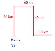 शिल्पा प्रतिदिन एक पार्क में टहलने जाती है। एक सुबह, वह अपने घर से टहलना आरंभ करती है,और उत्तर की ओर 40 km चलती है फिर वह दाईं ओर मुडती है और 60 km चलती है। वह फिर से दाईं ओर मुडती है और 40 km चलती है।अंत में वह बाईं ओर मुडती है, और 30 km चलती है वह अपने घर से कितनी दूरी पर है?