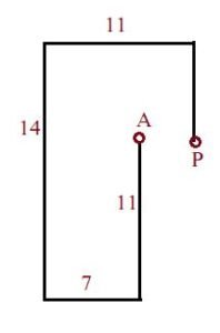 शुभम बिंदु A से शुरू होकर दक्षिण दिशा में 11 km गाड़ी चलाता है। फिर वह दाएँ मुड़ता है और 7 km गाड़ी चलाता है। इसके बाद वह फिर दाएँ मुड़ता है और 14 km गाड़ी चलाता है। फिर वह दाएँ मुड़ता है और 11 km गाड़ी चलाता है। अंत में वह दाएँ मुड़ता है और 3 km गाड़ी चलाकर बिंदु P पर रुकता है। बिंदु A पर दोबारा पहुँचने के लिए उसे कितनी दूरी सबसे कम दूरी और किस दिशा में गाड़ी चलानी चाहिए?