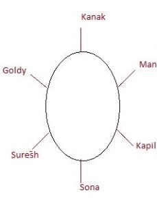 छह मित्र एक वृत्ताकार स्थिति में बैठे हुए हैं। वे सभी केंद्र की ओर मुख करके बैठे है कनक, सोना के दाईं ओर तीसरे स्थान पर है। कपिल, मणि के ठीक बगल में है। गोल्डी, मणि के दाईं ओर दूसरे स्थान पर बैठी है। सोना, कपिल और सुरेश के ठीक बगल में है। गोल्डी के दाईं ओर ठीक बगल में कौन बैठा है?