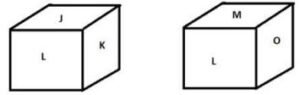 एक पासे के विभिन्न फलकों पर छह अक्षर J, K, L, M, N और O लिखे गए है। इस पासे की दो स्थितियों को नीचे चित्र दर्शाया गया है। N के विपरीत फलक पर आने वाले अक्षर की पहचान कीजिए।