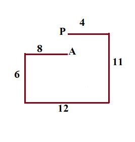 विनोद बिंदु A से चलना शुरू करता है और पश्चिम की और 8km ड्राइव करता है। फिर वह बाएं मुड़ता है, 6km ड्राइव करता है।फिर वह बाएं मुड़ता है और 12 km ड्राइव करता है।फिर वह बाएं मुड़ता है और 11km ड्राइव करता है। वह अंतिम बार बाएं मुड़ता है, 4 km ड्राइव करता है और बिंदु P पर रुक जाता है। बिंदु Aपर फिर से पहुँचने के लिए उसे कितनी दूर (सबसे छोटी दूरी) और किस दिशा में ड्राइव करना चाहिए? ( जब तक निर्दिष्ट न किया जाए, सभी मोड़ केवल 90 – डिग्री मोड़ हैं।)