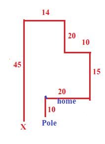 विपुल अपने घर से निकलता है, और पूर्व की ओर 20 m चलता है और फिर वह बाएं मुड़ता है और 15 m चलता है। फिर से वह बाएं मुड़ता है। और 10 m चलता है फिर वह दाएं मुड़ता है 20 m चलता है फिर वह बाएं मुड़ता है 14 m चलता है वह अंतिम बार बाएं मुड़ता है और 45 चलकर बिंदु X पर रूक जाता है वह अपने घर के दक्षिण में 10 m की दूरी पर स्थित खंभे से कितनी दूर है, (मान लीजिए कि सभी मोड केवल 90 डिग्री वाले मोड़ है।)